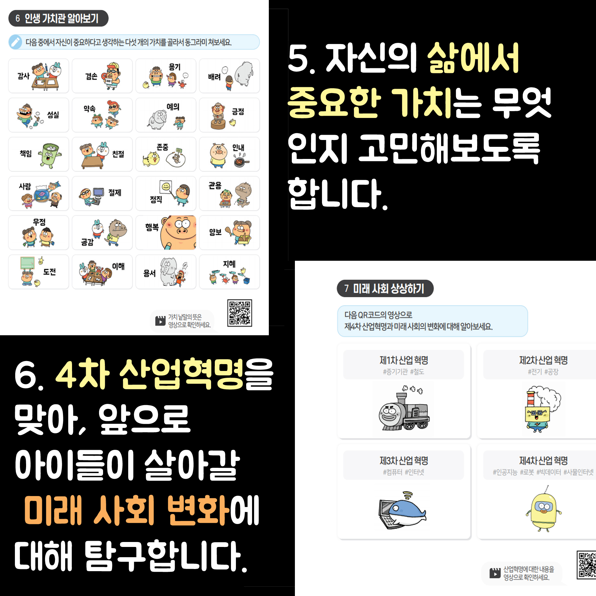 존 홀랜드 박사의 직업 성격 이론을 바탕으로 다양한 직업 탐색을 하되, 공동체 가치를 중시하는 인성 교육과 제4차 산업혁명과 관련된 미래 탐구까지 담았습니다. (진로+인성+미래 교육)
