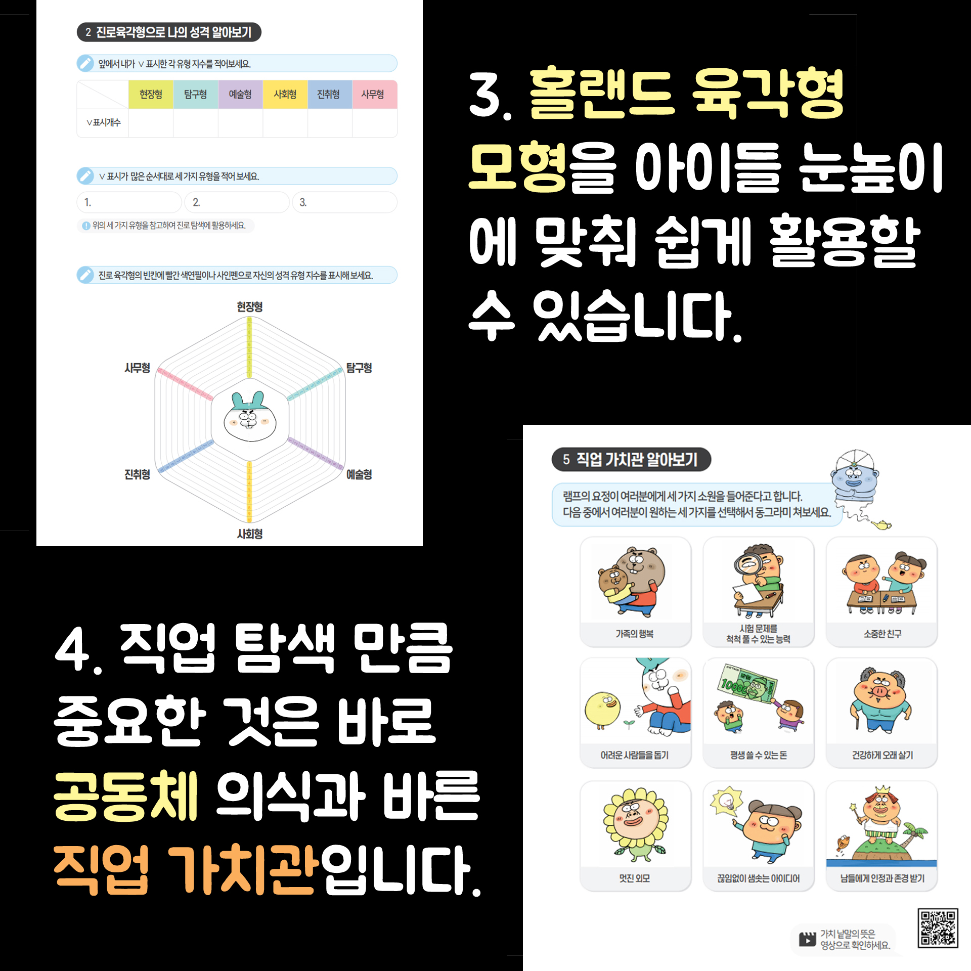 존 홀랜드 박사의 직업 성격 이론을 바탕으로 다양한 직업 탐색을 하되, 공동체 가치를 중시하는 인성 교육과 제4차 산업혁명과 관련된 미래 탐구까지 담았습니다. (진로+인성+미래 교육)