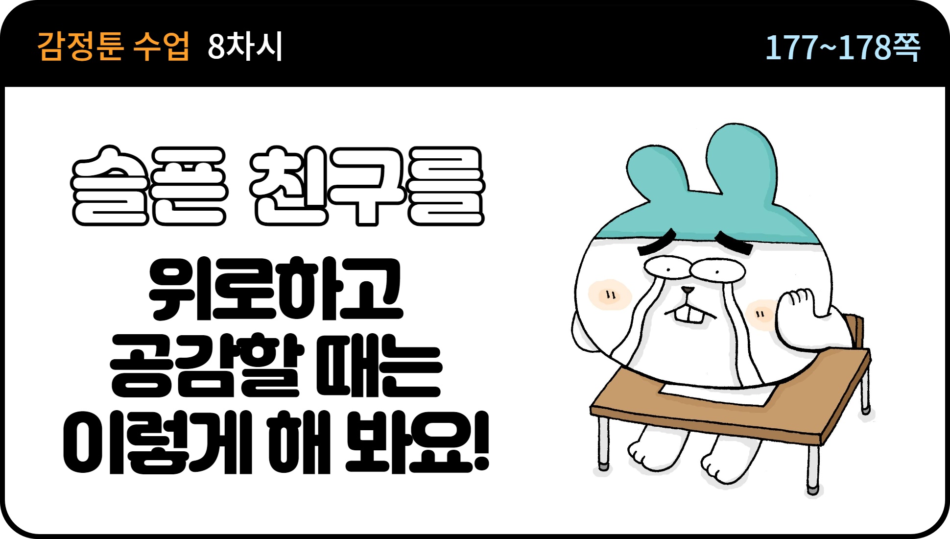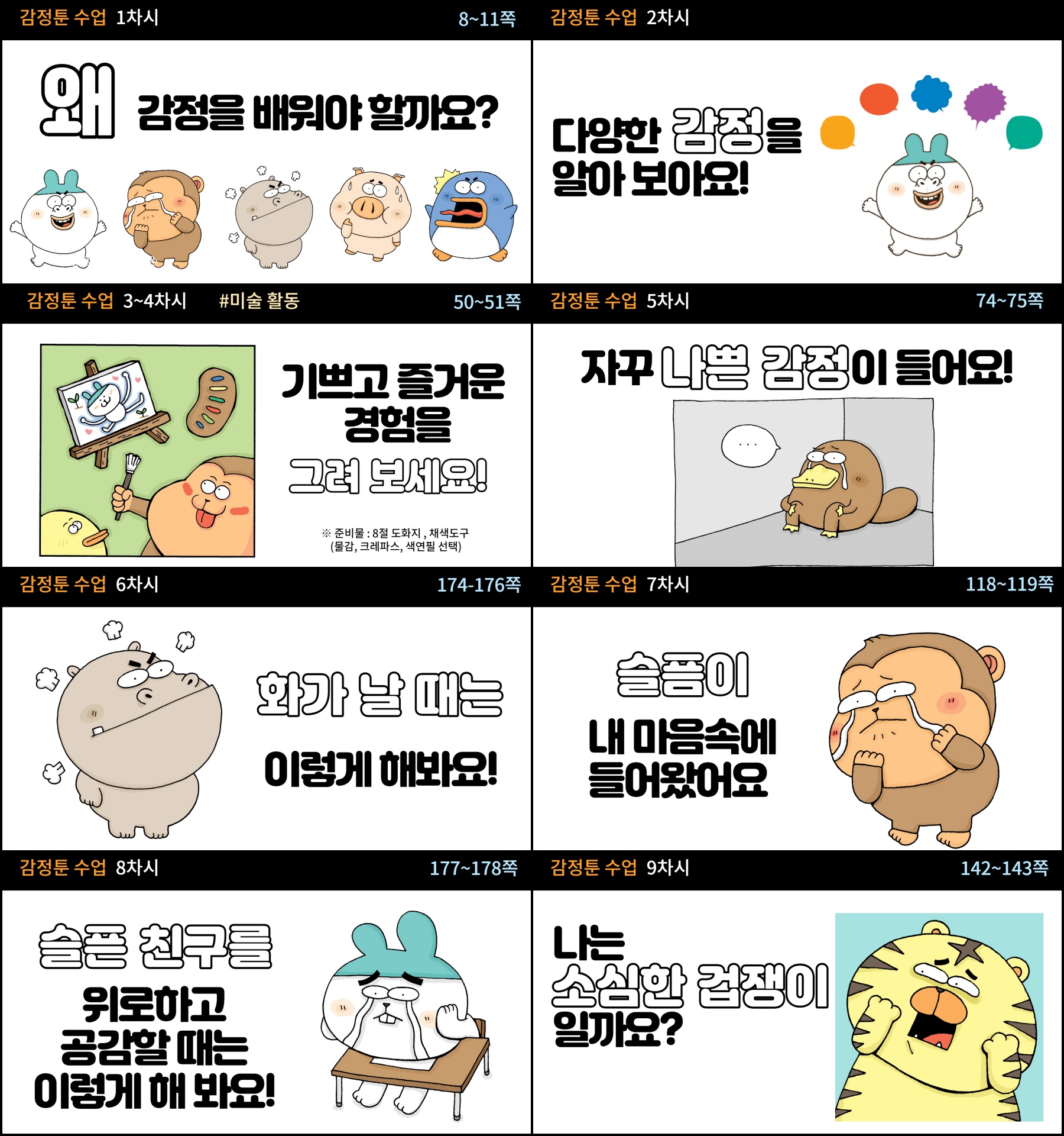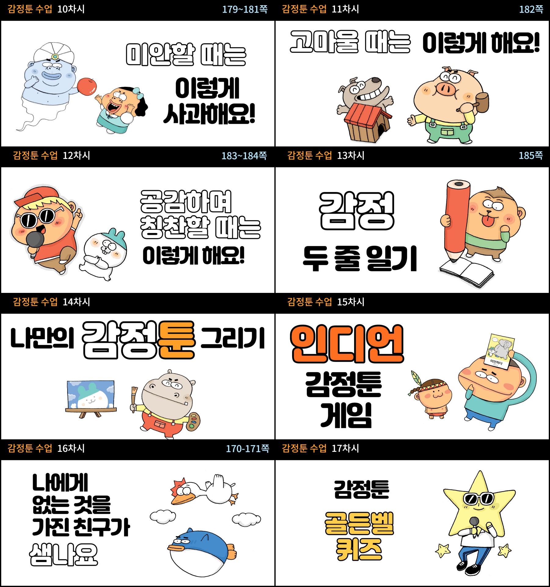 ※책의 구성 : 만화로 감정 낱말 설명 + 학생 활동지 페이지 +공감 대화법 및 감정 표현 방법 텍스트