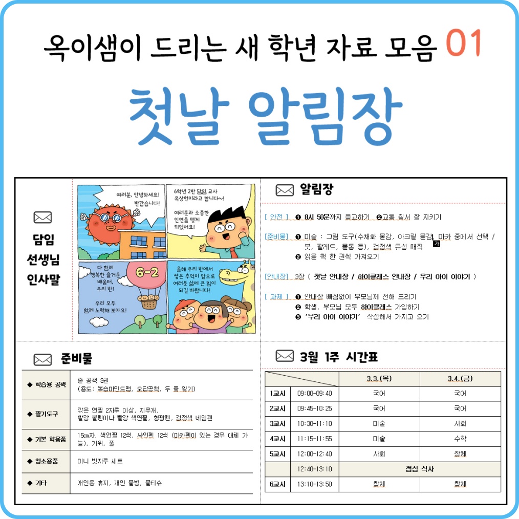 ▶첫날 알림장 자료 다운로드 (수정해서 활용하실 수 있어요.) → https://oktoon.net/420