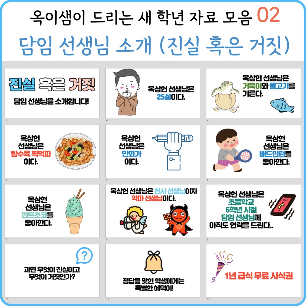 [첫날 담임 선생님 소개] 제가 초임 시절부터 선생님들이 즐겨 하시던 '진실 혹은 거짓 담임 선생님 소개' PPT입니다. ^^ (거짓은 모두 3개, 나머지는 모두 진실!) 미리캔버스 툴을 활용하면 뚝딱 만