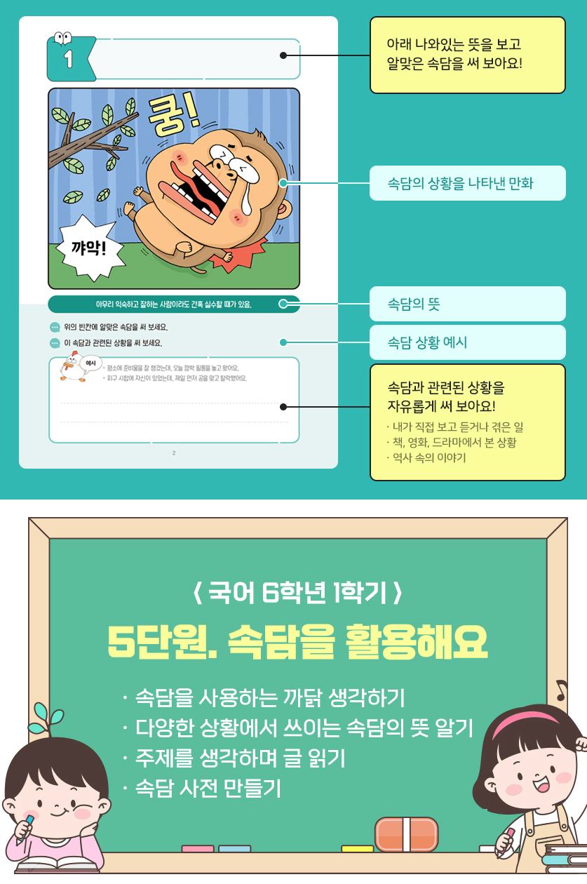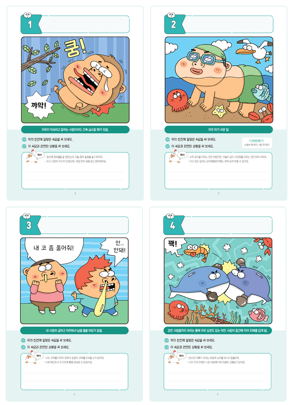 만화와 뜻을 보고 속담+ 관련된 글쓰기 활동까지 이어지는 놀이형 노트랍니다.
