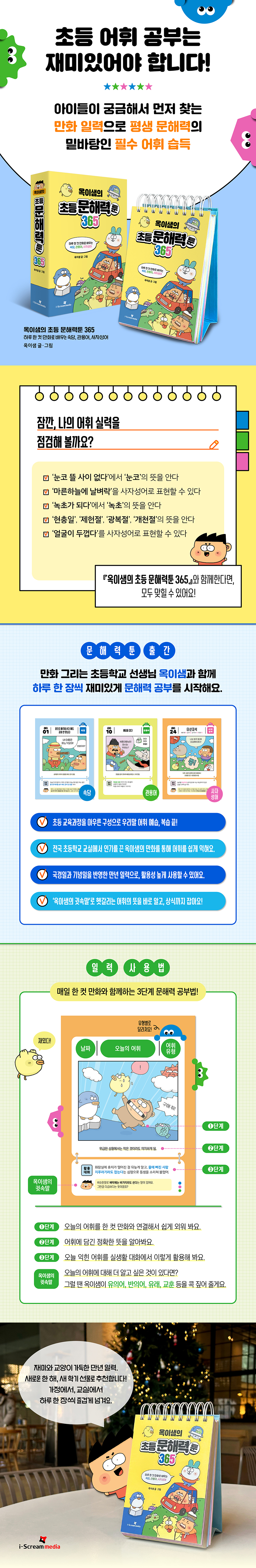 하루하루 커지는 재미, 하루하루 자라는 문해력과 창의력 초등 교육과정을 반영한 속담 122개+관용어 121개+사자성어 122개가 365컷의 만화와 함께 한 권에 담긴 만년 일력!초등 어휘 공부는 재미있